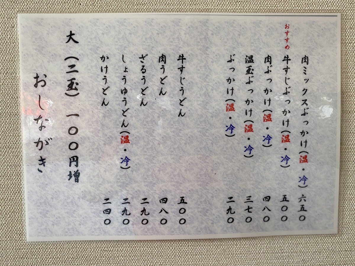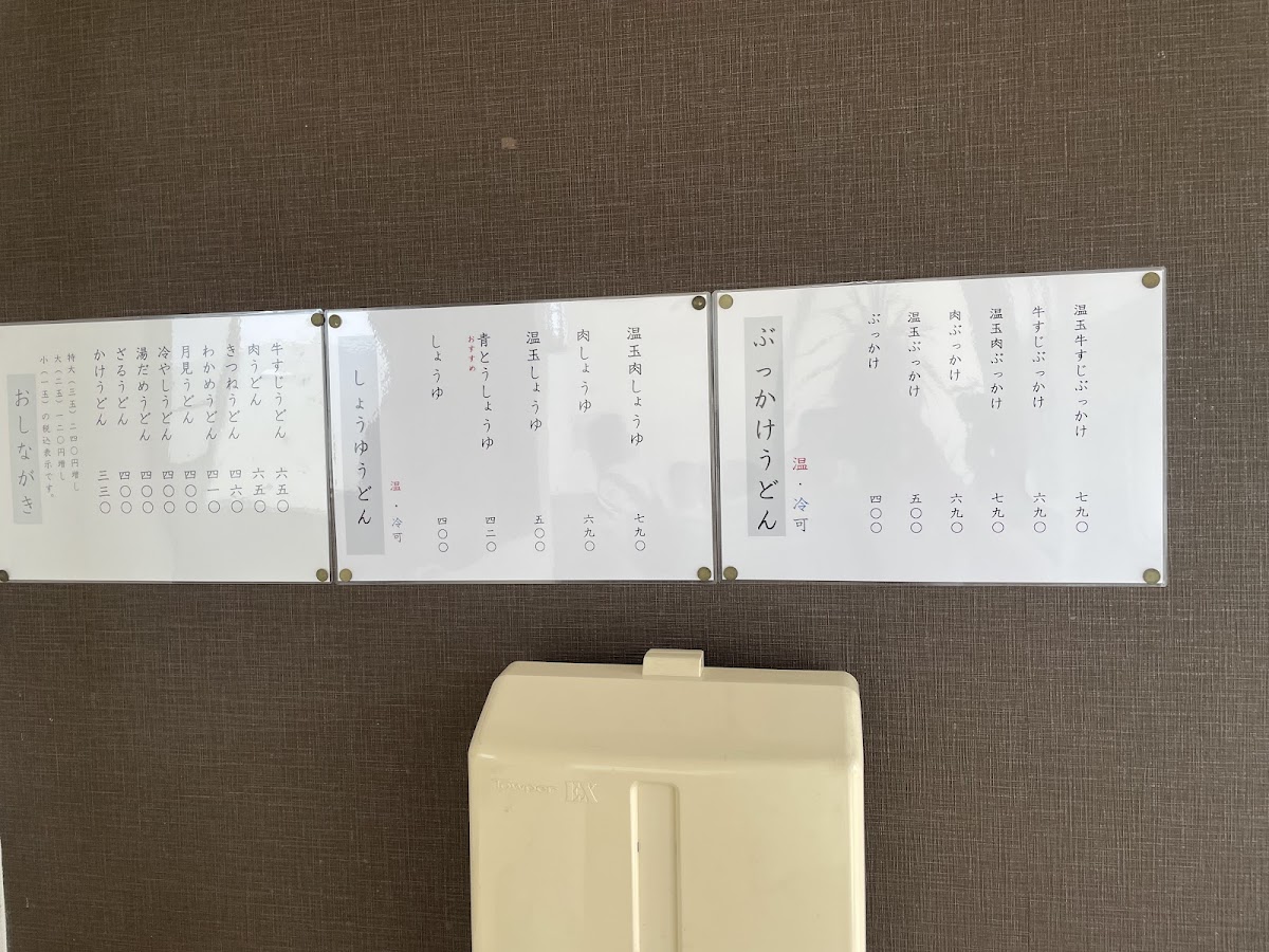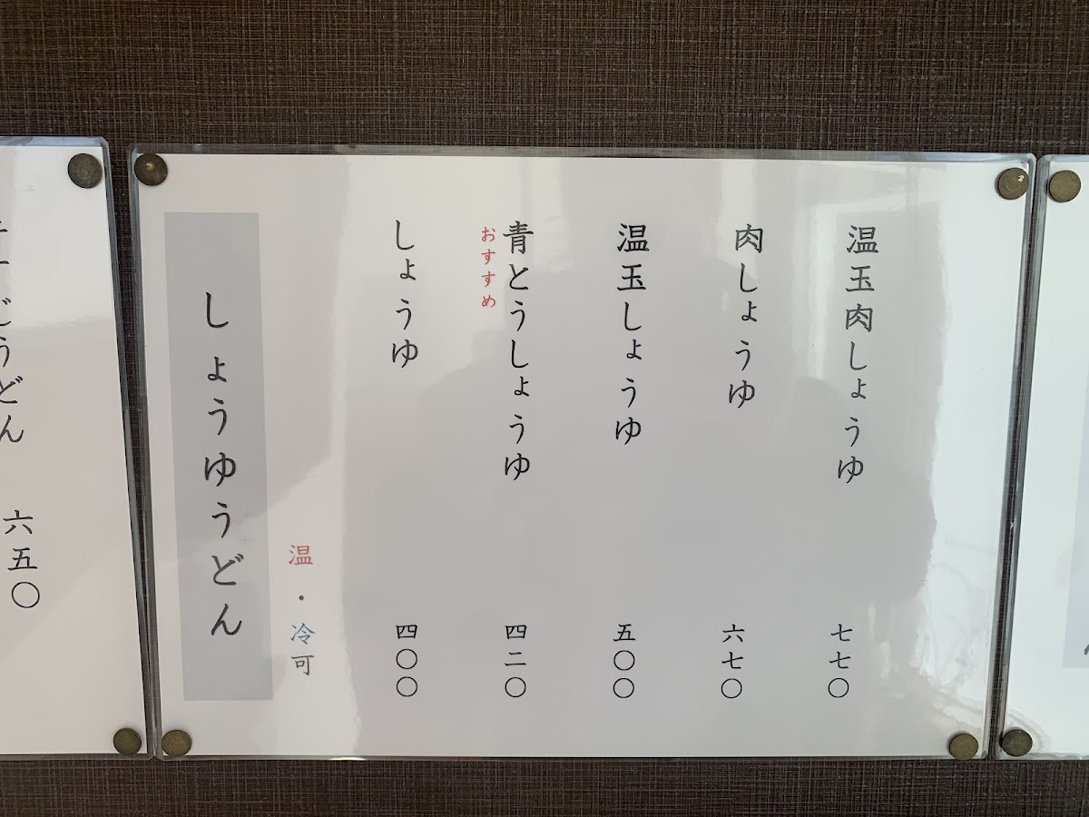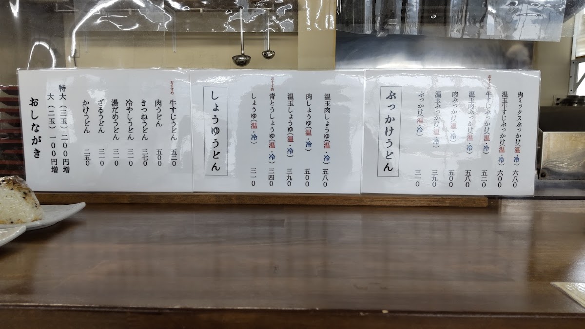 “ 平日13時ごろ訪問。店内でたくさん列がついていました。肉うどんや牛すじうどんはすでに終了、天ぷらや揚げ物などもほとんど終了しており人気具合が伺えます。おすすめだという"あおとううどん(青唐辛子)"を注文。天かすやねぎ、生姜など好きなだけトッピングし、タレが下に溜まってるとのことで良くかき混ぜてたべました。青唐辛子のうどんは初めて食べましたがピリ辛でとても美味しかったです。もう少し早めの時間に行ったほうがいろいろ選べてよかったと思います。 ”