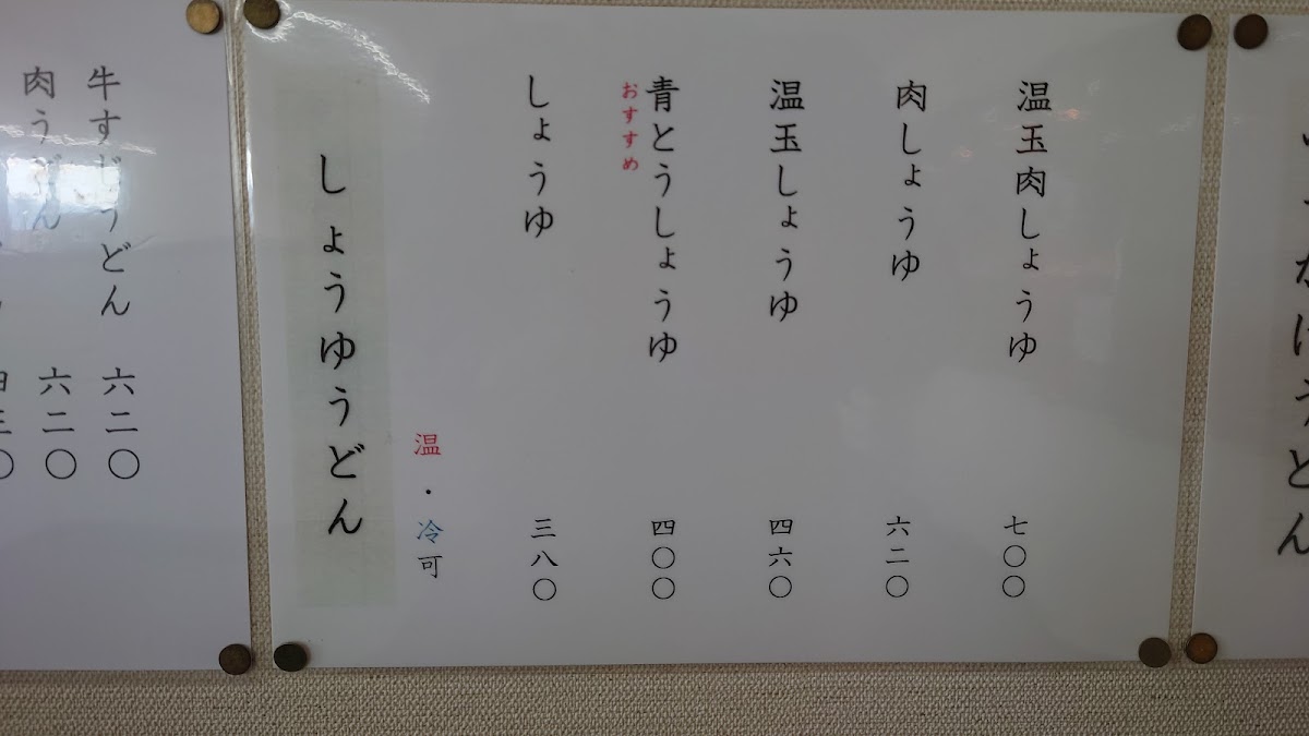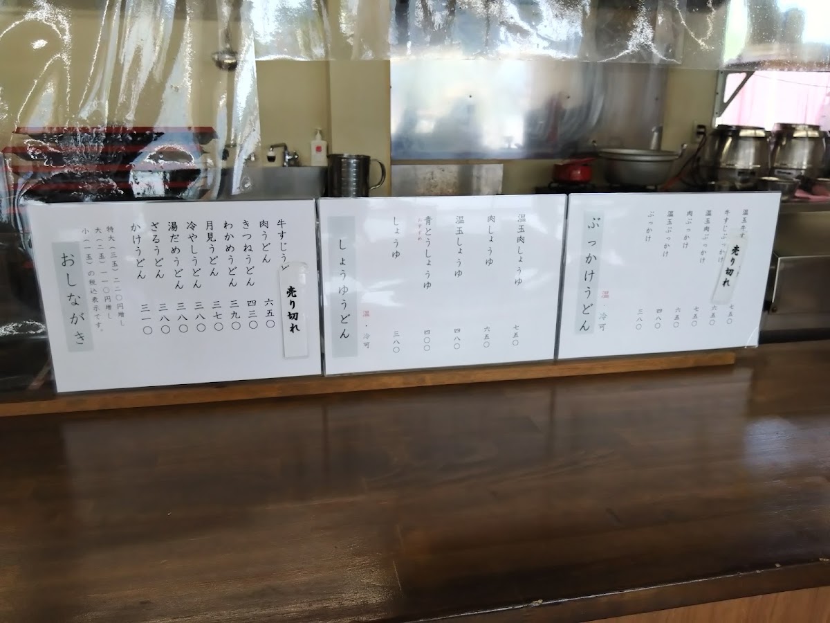 “ お盆(8/12)の13時ごろ伺いました。レジまで15名ほど行列ができており、目の前の方で肉うどんと牛すじうどんの具が売り切れ、肉系は終了と案内がありました。 私は青とうしょうゆうどん(冷やし)+温玉トッピングをオーダー。アスパラガス(さぬきのめざめ)の天ぷらはとても長い!150円で食べられるなんて嬉しい。 天ぷら類もどんどん揚げてくださってはいましたが売り切れが多かったです。大人気店! 私の後ろの方でぶっかけの出汁が切れたようでした。やはり早めの来店が良いですね! 天かす・ネギ・大根おろし・チューブのしょうがとわさびは自由にかけるスタイル。 子供用スプーンとフォークも置いてありました。 コシがあってとてもおいしいうどんでした。 辛いのはそこまで得意ではありませんが温玉で少しまろやかになり、クセになる辛さで美味しく食べられました。 アスパラ天もまだあたたかく、ジューシーで美味しかった!! かけうどん(温)とアジフライを頼んだ子供も、あまりのおいしさに無言でモリモリたべていました!笑 6人のお座敷3と、4人掛けテーブルがいくつか。1人で訪れている方や仕事の休憩中のサラリーマンさんも多く来ておられ回転は早いです。 たまたまかもしれませんが、店内とても暑くて、青とううどんを食べたこともあり汗だくでした!笑 駐車場も常時満車で待ち状態でしたので小さいお子さんいらっしゃる方は特に注意した方が良いです。ひかれそうになっている子がいてヒヤリ。 美味しかったのでまた行きたいです。 ”